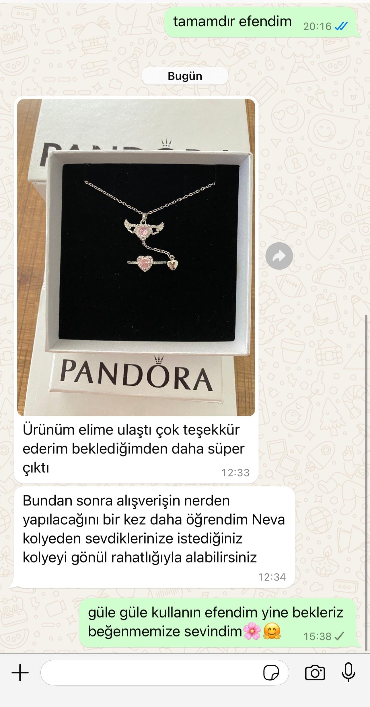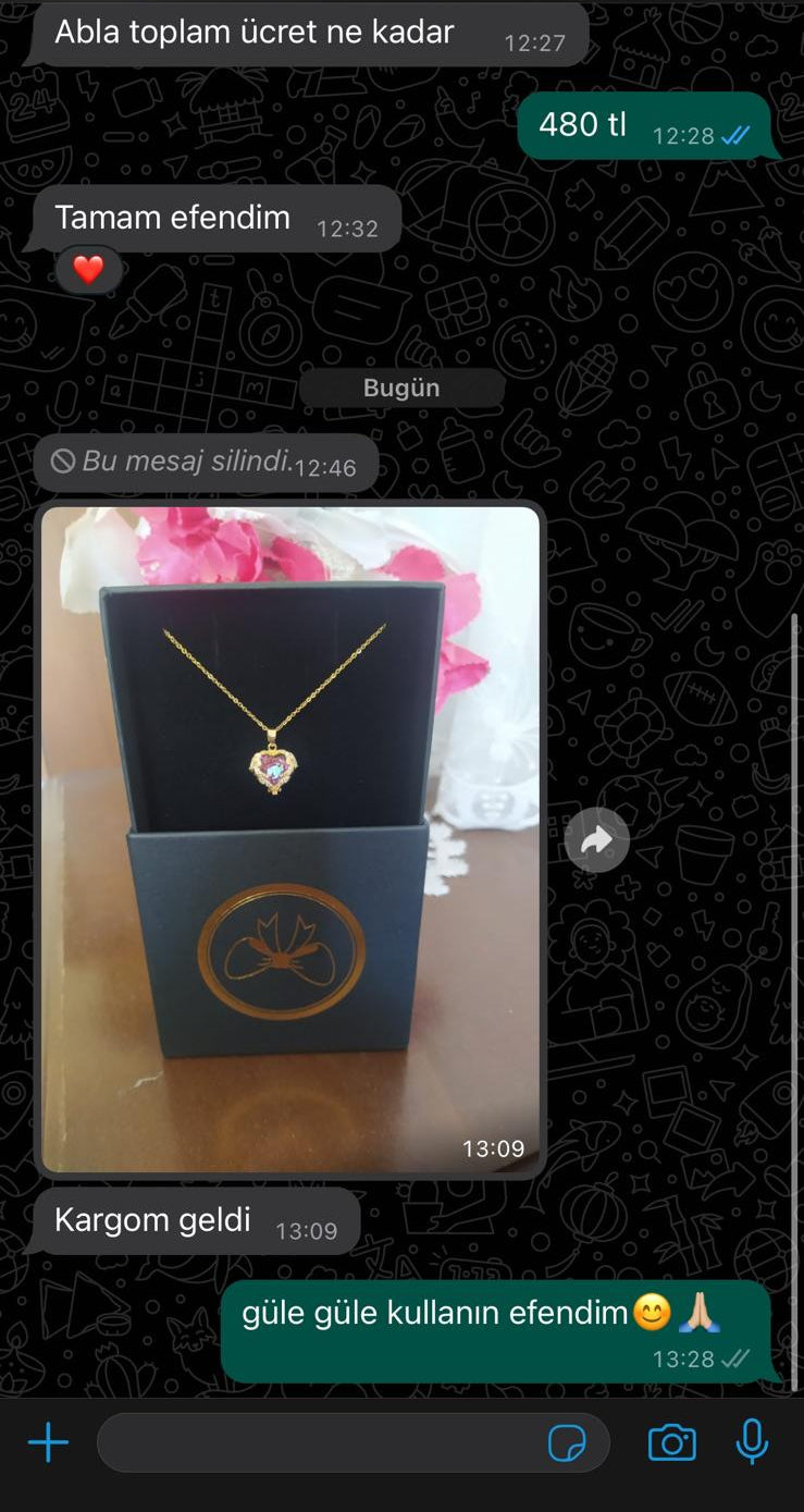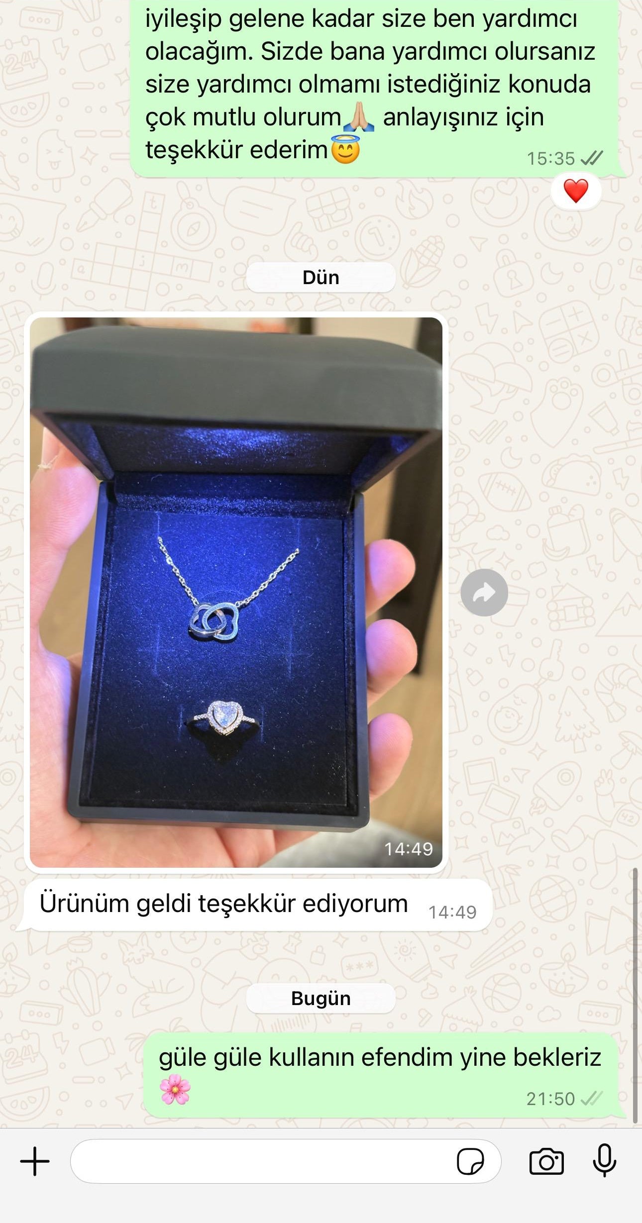 “Her şey mükemmeldi: hızlı kargo, güzel paketleme ve muhteşem kolye! Tekrar sipariş vereceğim 💖”