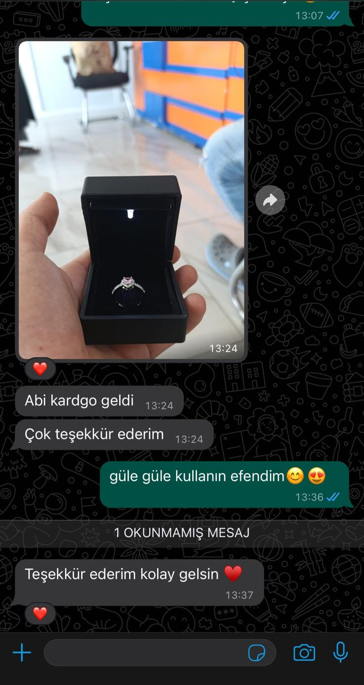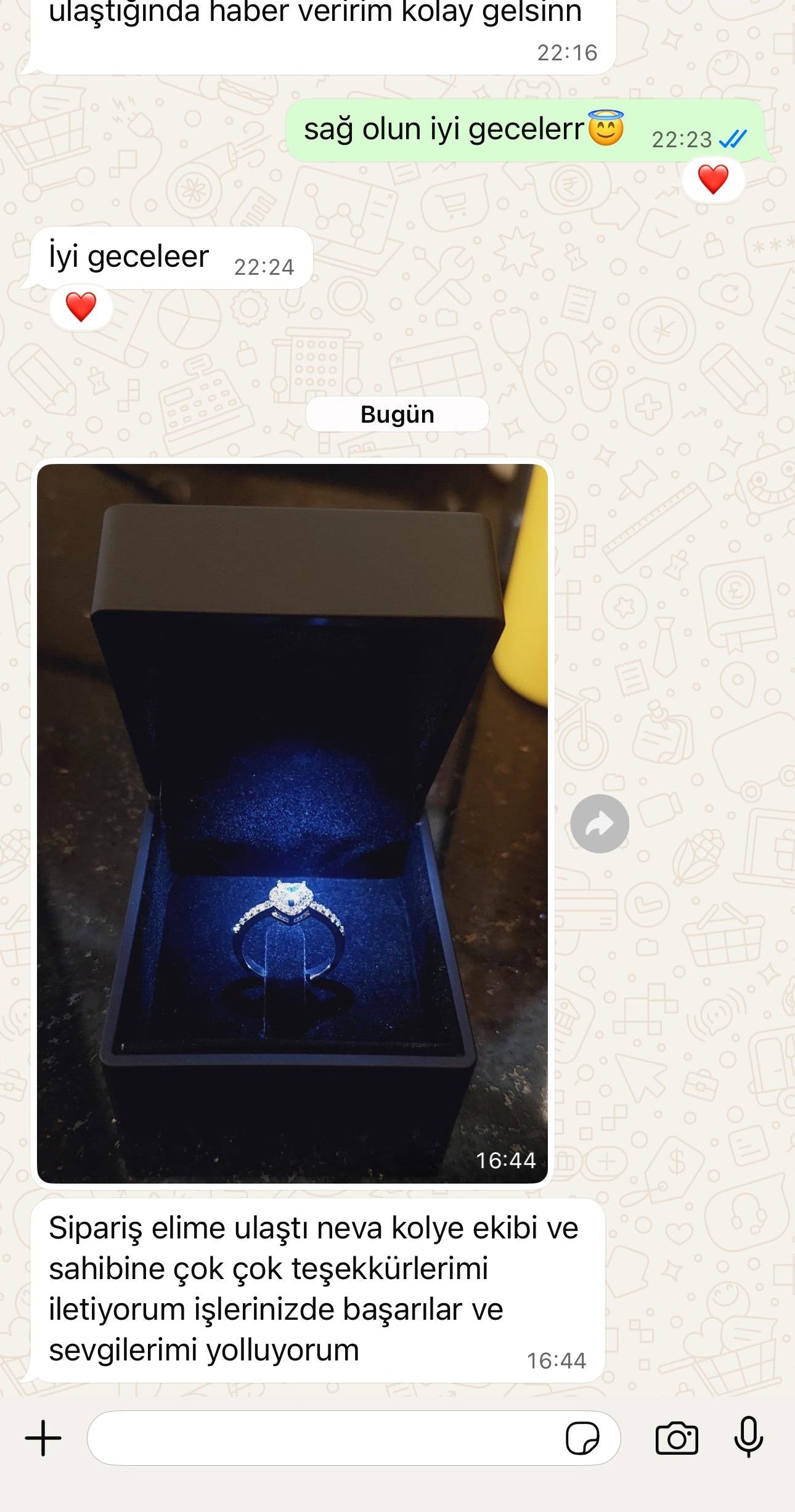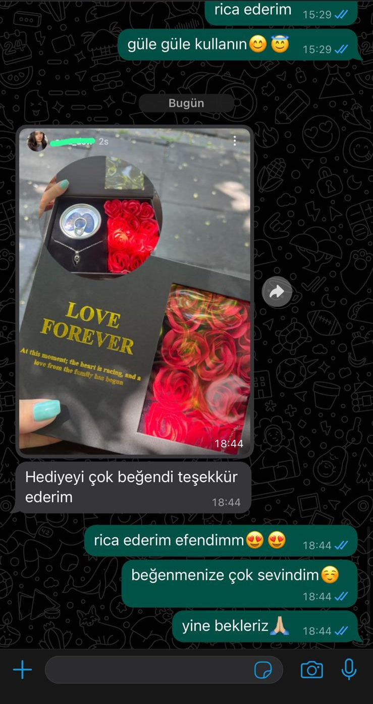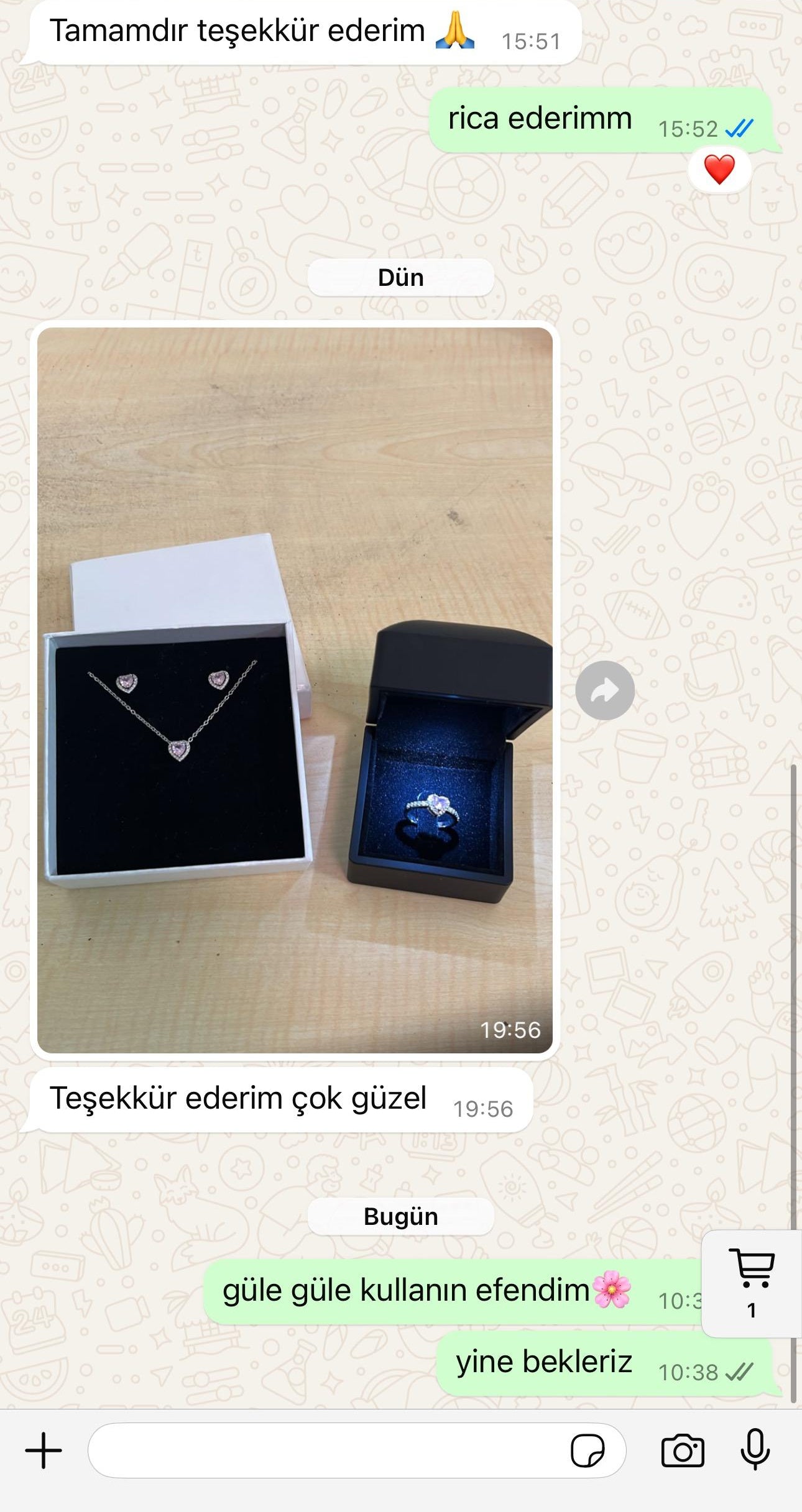 “Her şey mükemmeldi: hızlı kargo, güzel paketleme ve muhteşem kolye! Tekrar sipariş vereceğim 💖”